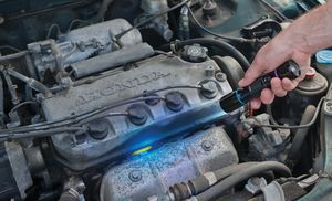 - Флуоресцентная добавка в антифриз вливается в систему, и дефект быстро обнаруживается с помощью освещения подкапотного и салонного пространства индикаторной лампой. Этот способ эффективен для определения скрытых течей.