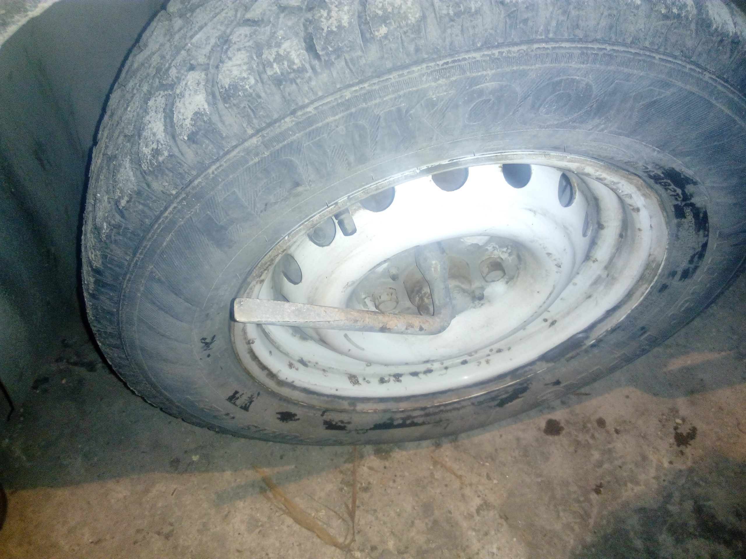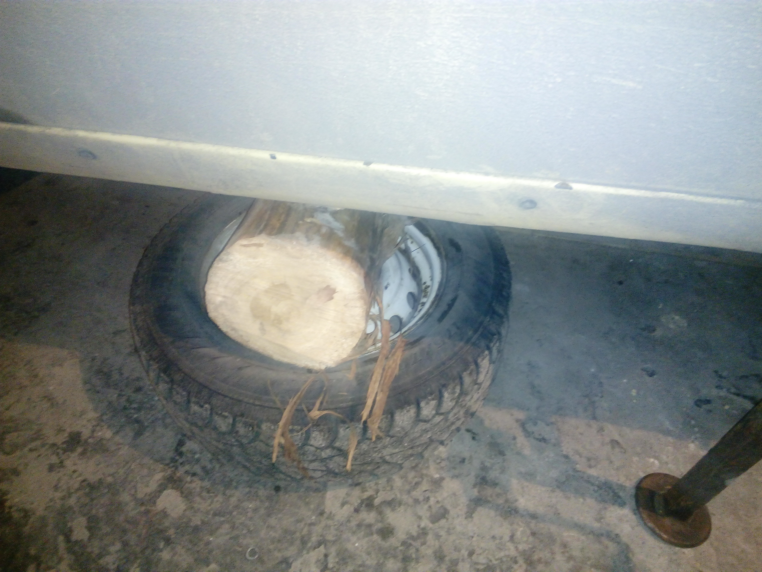 - Подкладываем колесо и бревно(любой другой предмет который выдержит нагрузку автомобиля.