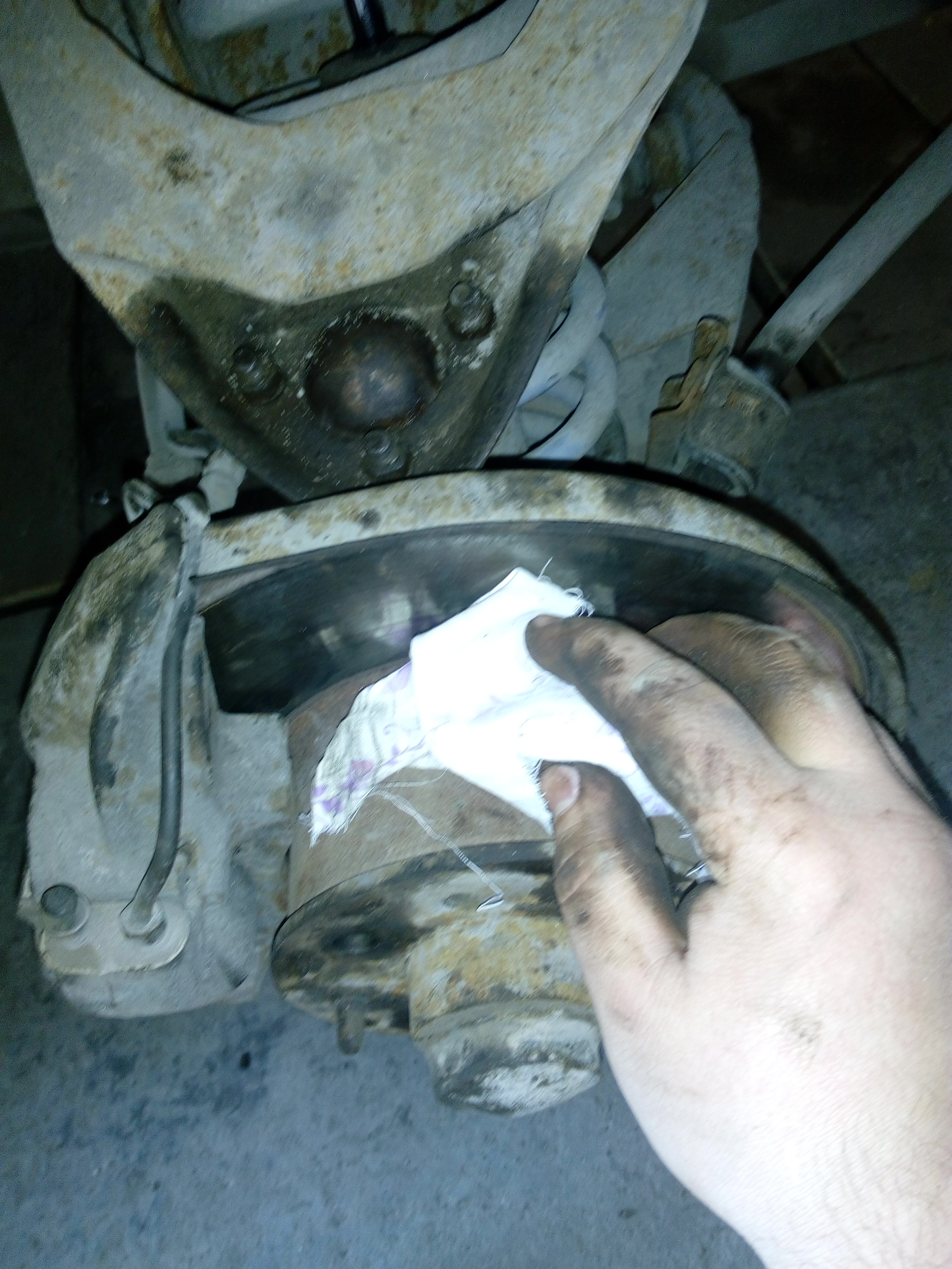- Руками проворачиваем тормозной диск в разные стороны и слушаем какая шаровая пришла в негодность. Нижняя или верхняя. В нашем случае это верхняя.